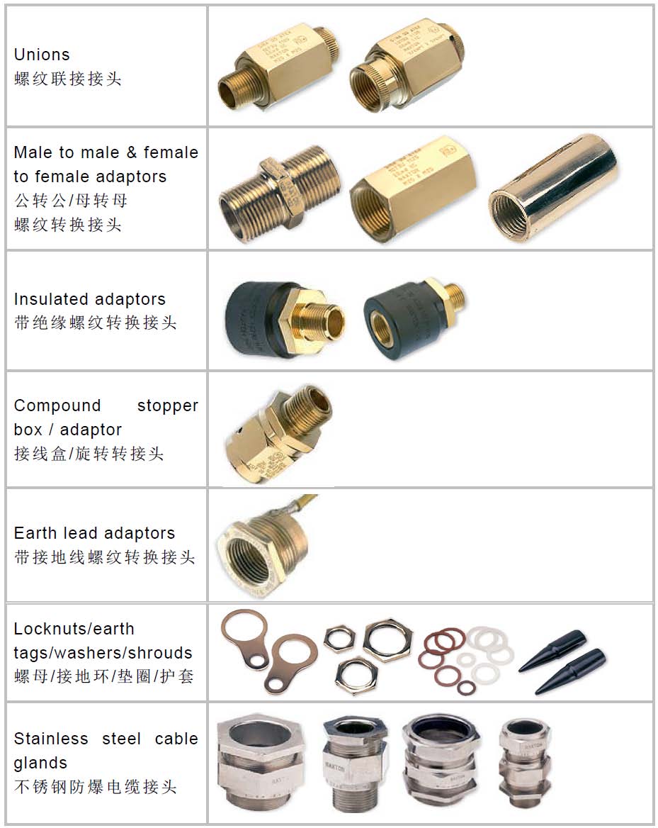 主要產(chǎn)品:防爆螺紋轉(zhuǎn)換接頭,如隔爆及增安型螺紋適配器、縮減器、絲堵、呼吸接頭及其它附件如螺母、接地圈、IP密封圈、鋸齒墊圈等。